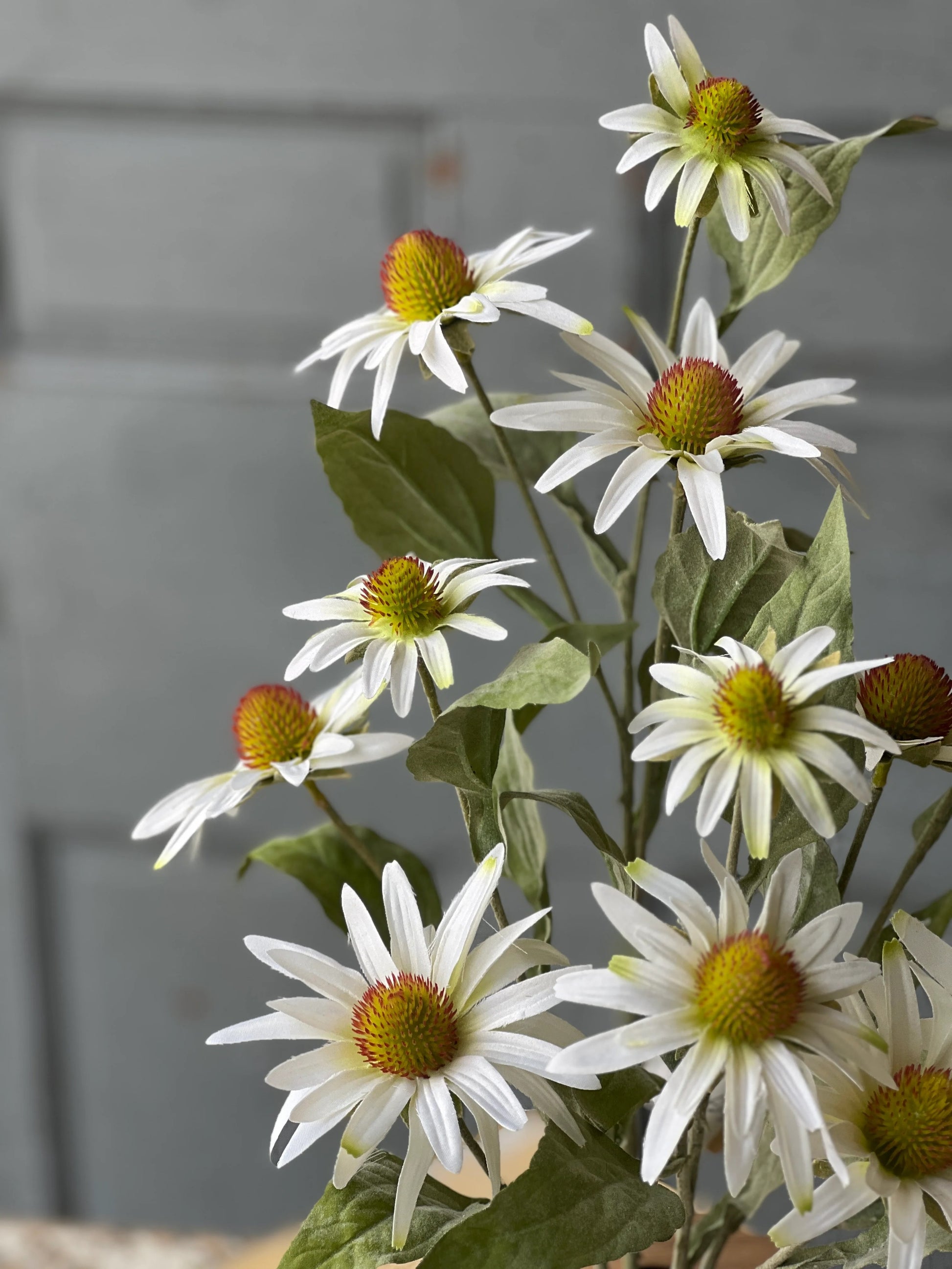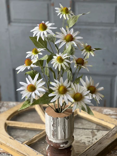 Showy white coneflowers with pretty detailed centers and lightly flocked leaves add just the right note of sunshine to displays! Versatile and easy to pair with other decor.