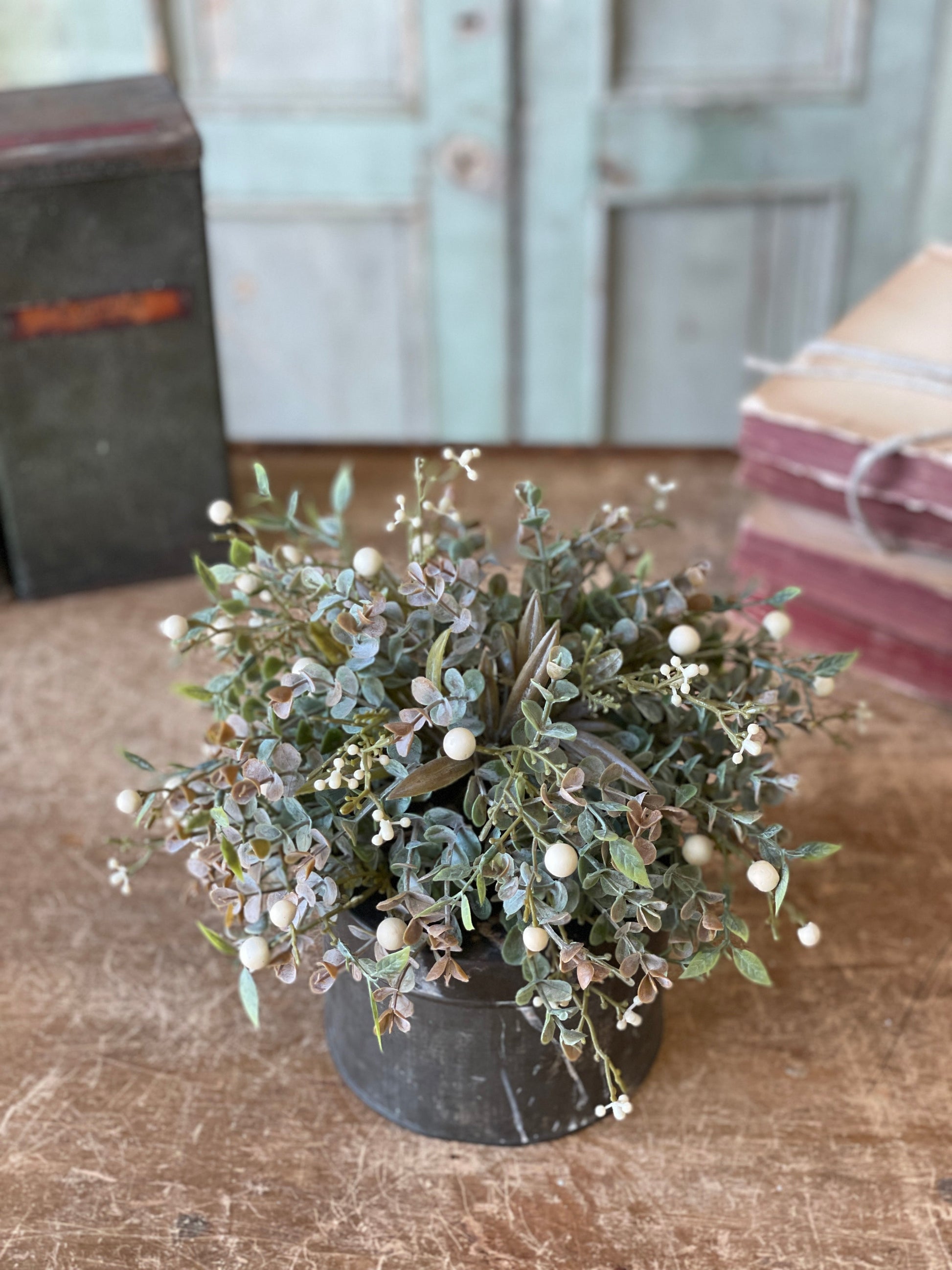 A lush bed of cool toned eucalyptus and mixed leaves makes a serene background for sprays of berries and small berry-like orbs.