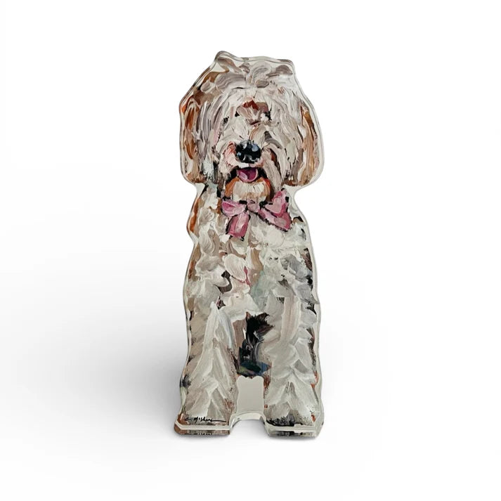 Display your love for your furry friend with this charming Goldendoodle acrylic shelfie. Featuring vibrant artwork mounted on a thick, weighted acrylic block, it creates an eye-catching three-dimensional effect perfect for desks, shelves, or nightstands. At approximately 5"X7", and a sturdy 3/4" thick, this piece adds personality without taking up much space. An ideal gift for dog lovers or a delightful way to celebrate your own beloved pup.