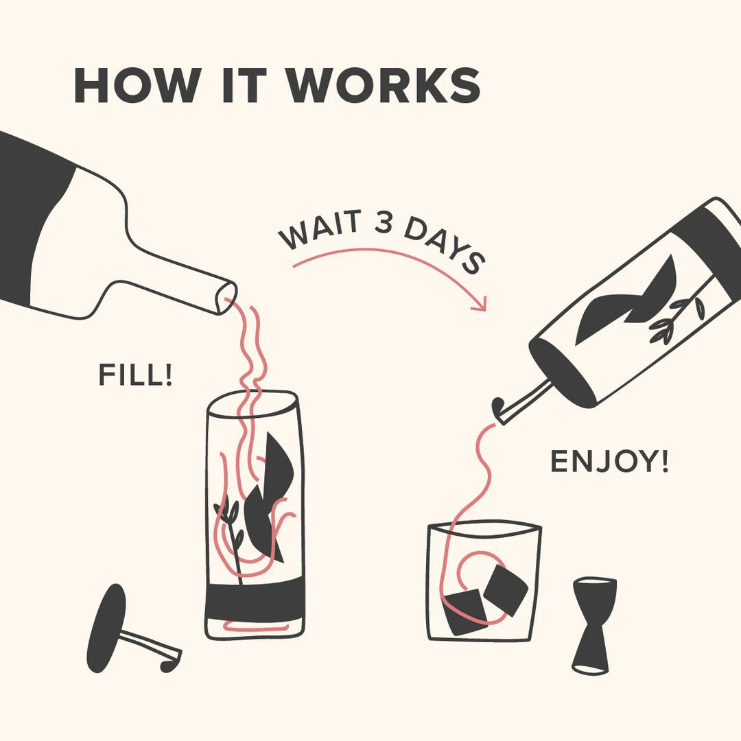 Easy mix and pour your favorite summertime drink. Our signature kits include a 16 oz. glass jar with custom filtering pour spout, pre-measured ingredients, infusion instructions and cocktail recipes. Packaged in a facility that handles tree nuts, dairy products and soy.