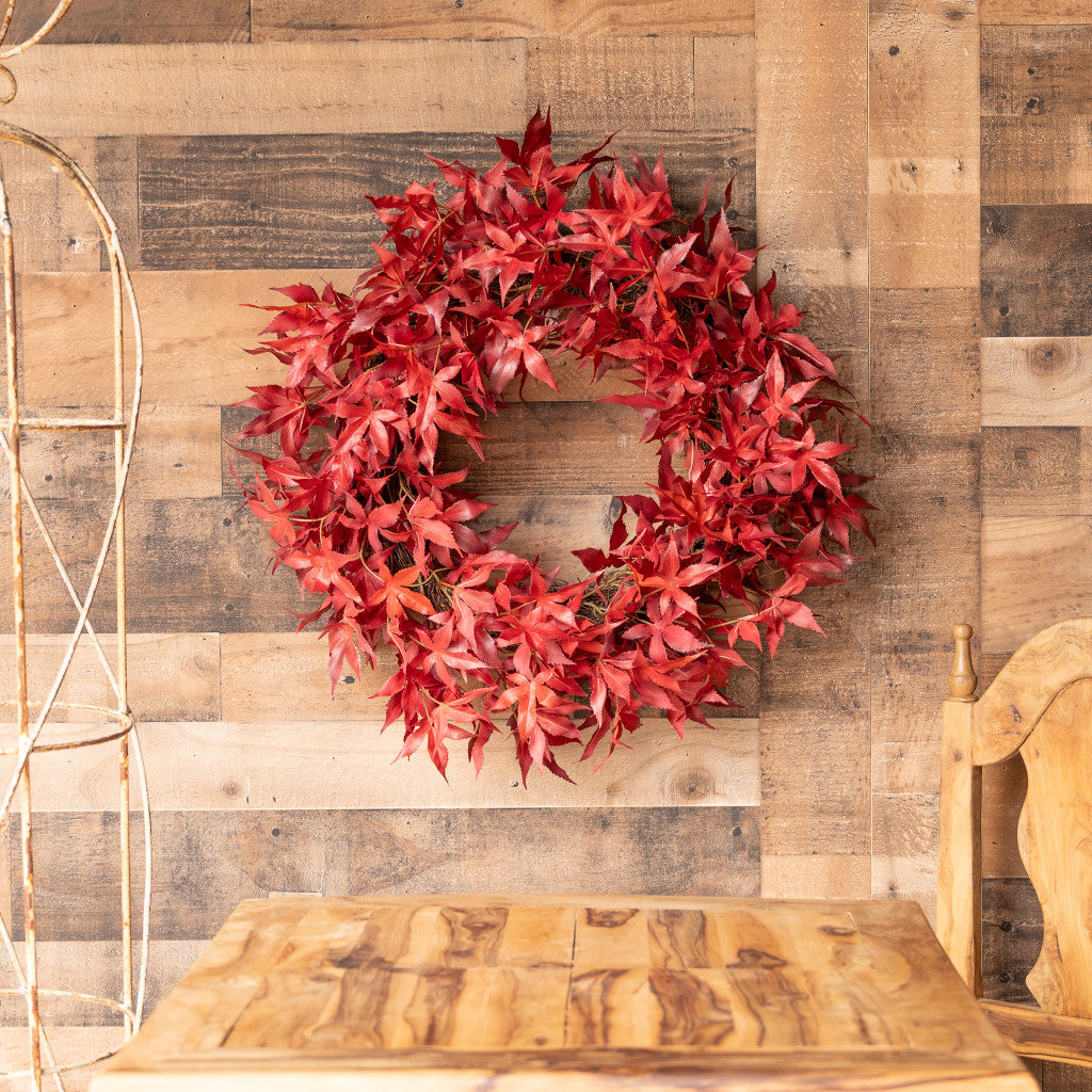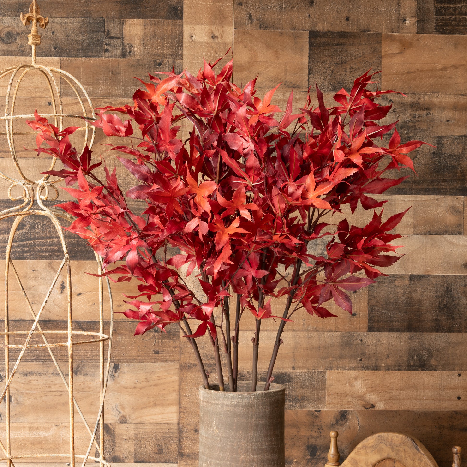 Bring vibrant seasonal color to any display with this Red Japanese Maple Leaf Collection. Showcasing lifelike faux maple leaves in rich crimson tones, this striking branch adds a bold, elegant touch to floral arrangements, centerpieces, or standalone decor. The finely detailed leaves and natural branching create a graceful silhouette, perfect for capturing the beauty of autumn or adding a splash of color year-round.