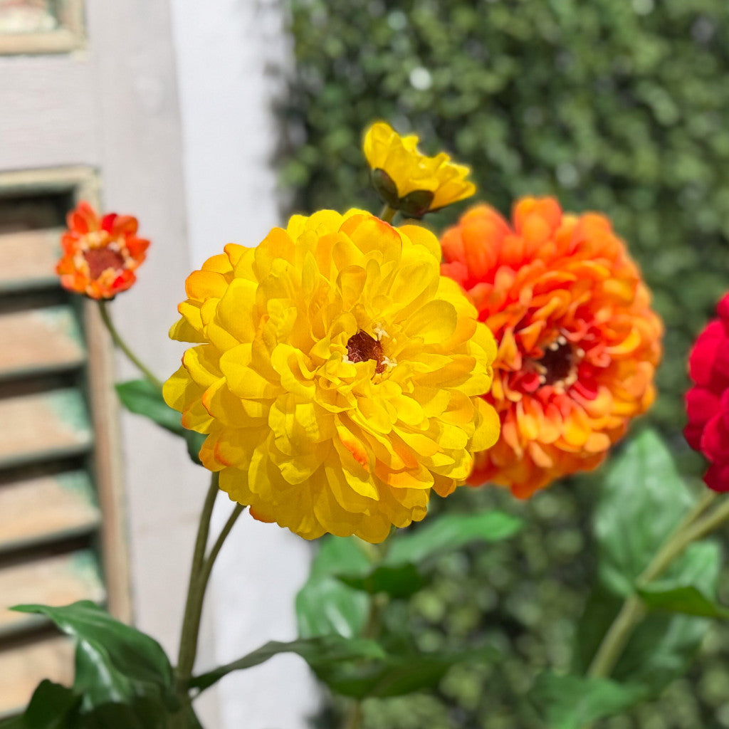 Our 26-inch Zinnia Flower Stem brings a cheerful splash of color and a touch of natural beauty to any setting. With one large, fully bloomed zinnia and a smaller budding flower on a single stem, this faux floral offers a lifelike representation of zinnias in their prime. The vibrant pink petals are complemented by lush green leaves, creating a fresh, lively look that’s perfect for brightening arrangements or displaying solo in a slender vase. Whether adding a pop of color to a bouquet or standing alone as an accent piece, this zinnia stem radiates charm and elegance without the need for upkeep.