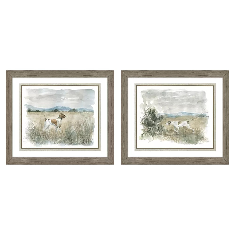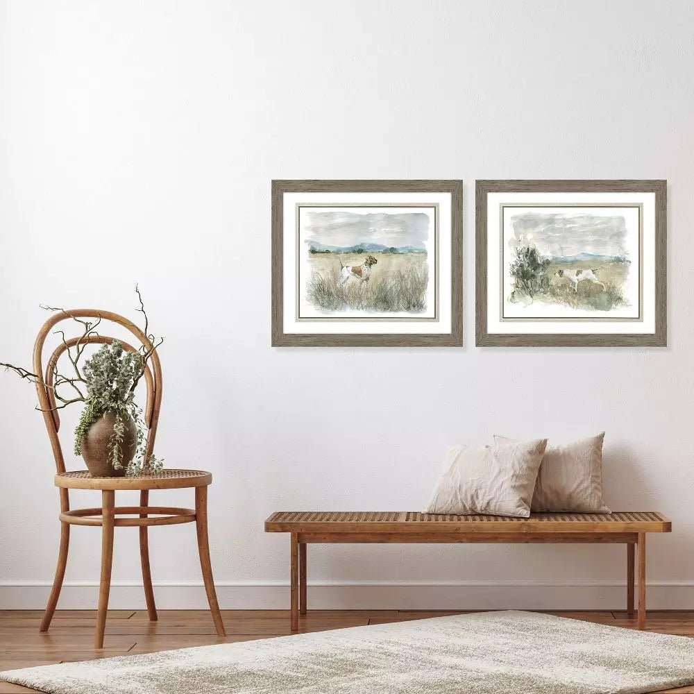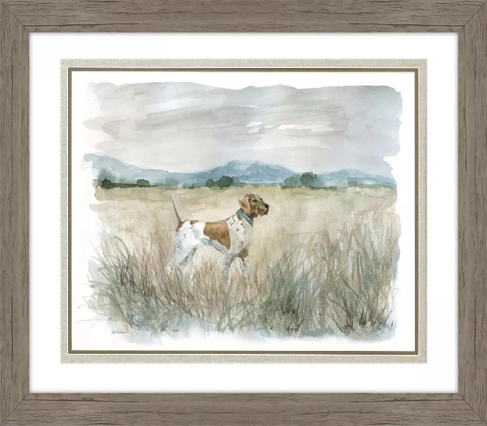 Hunting dog prints are perfect for a lodge getaway. Matted in white and framed in a block profile moulding with a distressed wood finish.