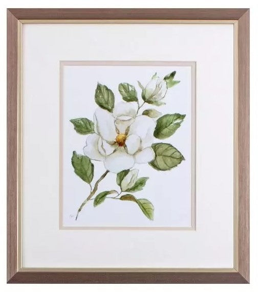 Magnolia prints that are double matted and framed under glass with a metallic bronze frame.