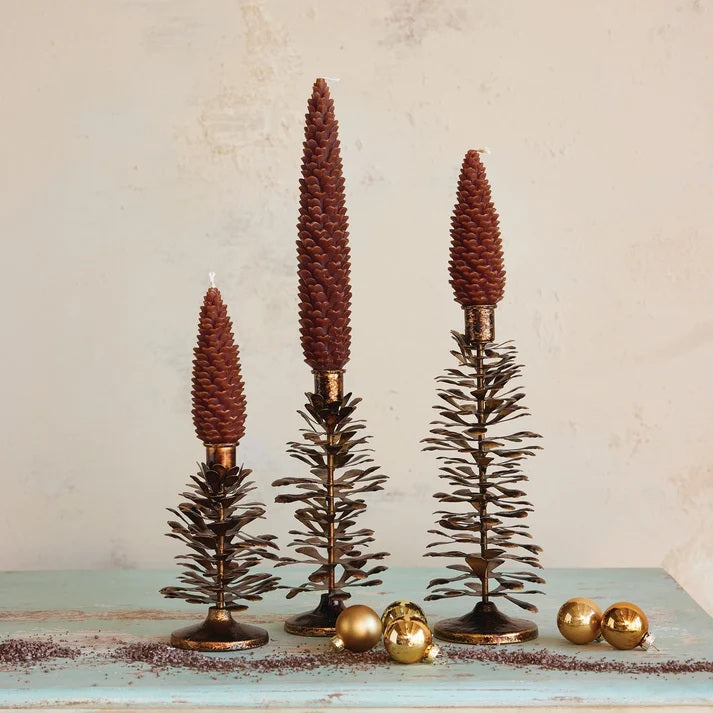 3-1/2" Round x 10"H Metal Pinecone Shaped Taper Holder, Antique Gold Finish