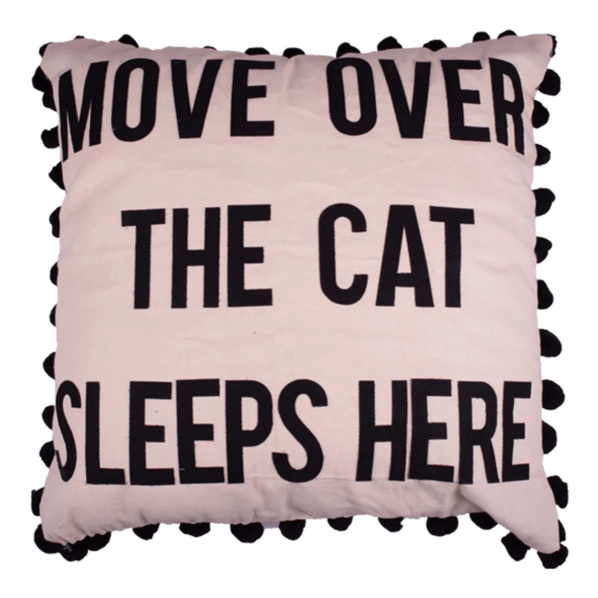 Make sure your guests know who's really in charge with our cat friendly pillow that states "Move over, the cat sleeps here!" It's the purrrrfect gift for any cat lover! The decorative pompoms and neutral color scheme make this pillow is a perfect addition to the cat lover's home or office!