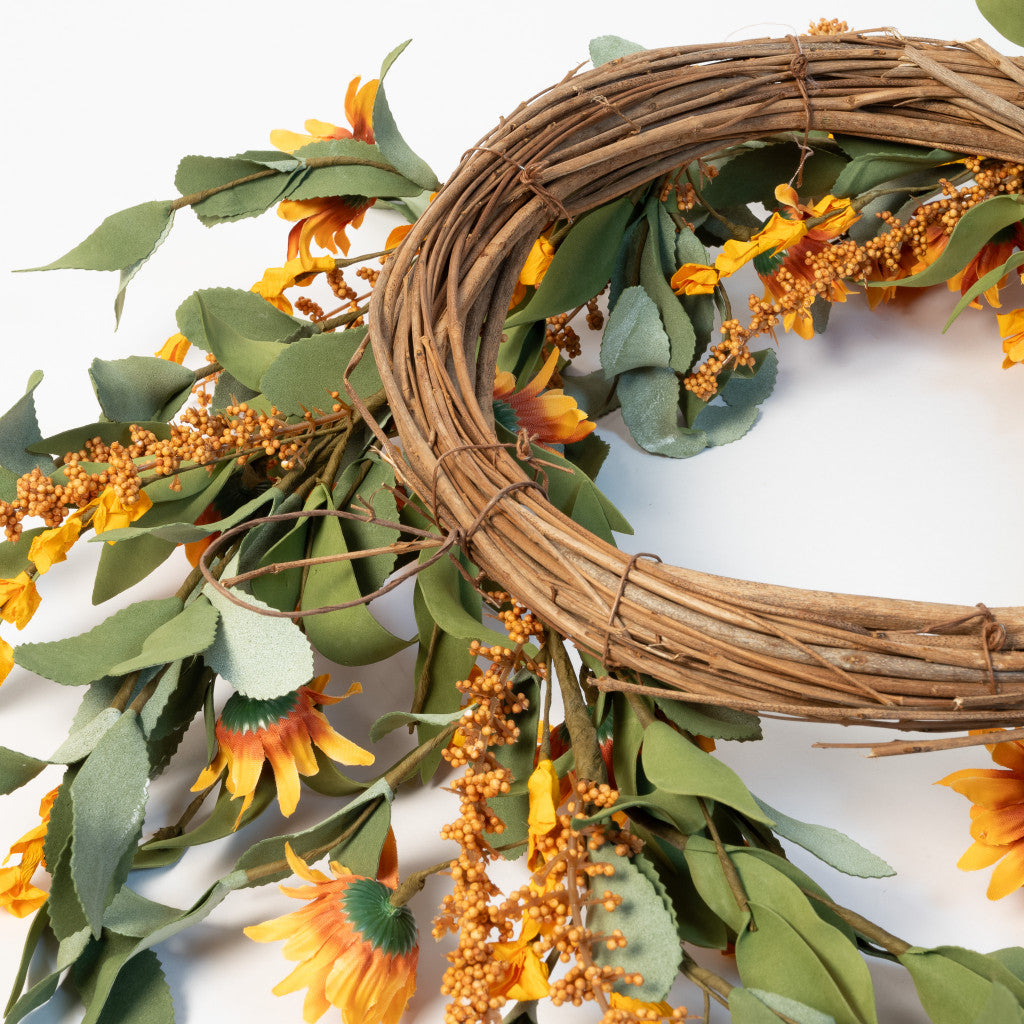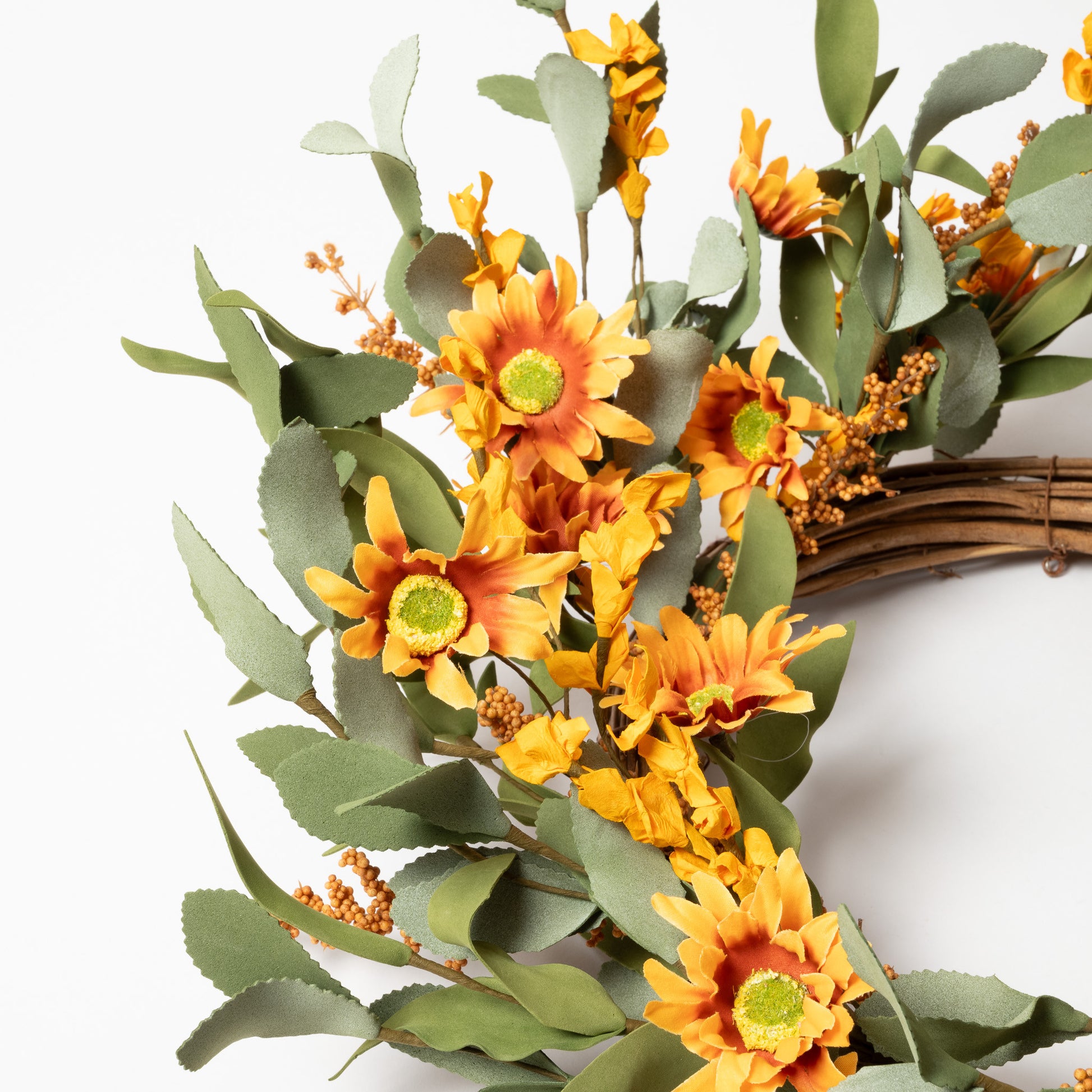 Embrace the perennial charm of the Sunflower Wreath, a delightful addition to any space seeking a touch of nature's joy. This 16-inch wreath is a symphony of vibrant faux sunflowers, their sunny faces interwoven with a variety of greenery, creating a lush and lifelike tableau. The robust hues of yellow and orange blossoms are a nod to the beauty of late summer and early fall, making this wreath an ideal choice for those looking to add a seasonal flair that remains timeless throughout the year. Handcrafted with attention to detail, each petal and leaf on this wreath is designed to mimic the intricate beauty of its natural counterparts. The durable construction ensures that this piece will maintain its allure without the need for watering or sunlight, making it a hassle-free enhancement to any decor setting. Whether displayed on a door to welcome guests or used as a centerpiece to enliven a gathering space, this sunflower wreath is a testament to the blend of artistry and the warmth of nature's design.